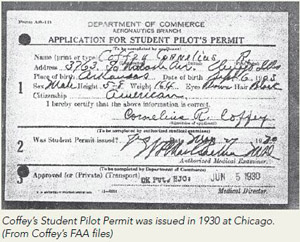 In 1936, Coffey received his commercial pilot’s license. Along with his application form was a note scrawled in pencil, “I want aviation to be my livelihood — flying and aircraft repair both.”