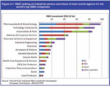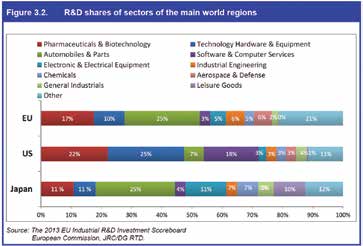 The charts above clearly show where innovation and research spending are being concentrated. They also show the regional disparities among national champion companies such as the biotech sector in the U.S. and the automotive sector in Japan and Europe. Interestingly, Japan ranked lower in technology hardware than the U.S., but as expected, was much higher in electronics. Europe also dedicates twice the amount of R&D to aerospace than the U.S. does, which is a surprising result. This might indicate how dependent the U.S. aerospace industry is upon the DOD for key R&D funding. Apparently U.S. investors are drawn more to higher returns in sectors that have more growth than aerospace.