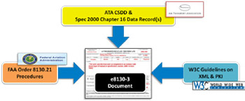 XML was designed so that can be read and understood easily. This type of data structure uses a globally-accepted general purpose set of W3C standards that the ATA refine for aviation industry use. XML is an outgrowth of HTML (used to display web pages) and SGML (used to display documents) and is used in transferring data between applications and Web sites. XML is quite readable and anyone can decipher the information contained within a typical XML message quickly and match it with a printed FAA 8130-3 form, as illustrated below: