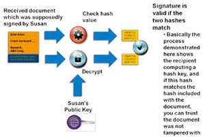 The flow of the illustrated processes demonstrates how a software application will use someone’s unique private digital certificate (key) to lock a document by creating a digital signature. PKI-enabled software will use an algorithm with the date, time, file and the signer’s digital identity (key), to lock the document. On the receiving end, it will validate a signed document.