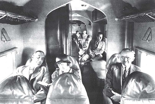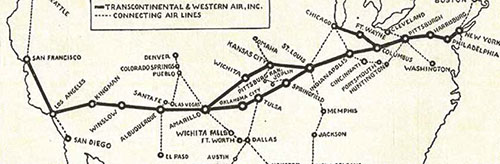 Since its inaugural flights in July 1929, Transcontinental Air Transport (TAT) had dazzled its coast-to-coast passengers with stunning airport lounges, meticulous meal service by restauranteur Fred Harvey, and comfortable Aerocar coach transportation between train and aircraft. Canopied walkways shielded travelers from wind or rain between the terminal and aircraft. Special Pullman cars were appointed with dining and sleeping options and the ever-present personal service of a steward. In the air, male “couriers” served meals on folding tables appointed with table linens and specially-designed china and flatware. A cross-country one-way ticket was about $350 and life insurance could be added for a reasonable fee.