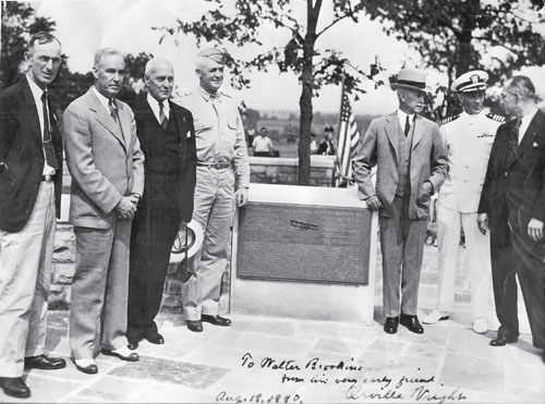 This picture was taken on August 19, 1940, Orville Wright’s sixty-ninth birthday, at Wright Hill overlooking Huffman Prairie in Dayton, Ohio. The occasion was the dedication of a 30-foot marble memorial commemorating the fields below, where the Wrights flew their early aeroplanes and taught America’s first flyers at the Wright’s flying school. Behind the monument, on a stone wall, the commemorative plaque lists students of the flying school. Many dignitaries attended the dedication, but pictured here is a remarkable assemblage of U.S. aviation pioneers. As early aviators, each of these men made repairs to their aircraft. All held leadership positions in business, government or military.