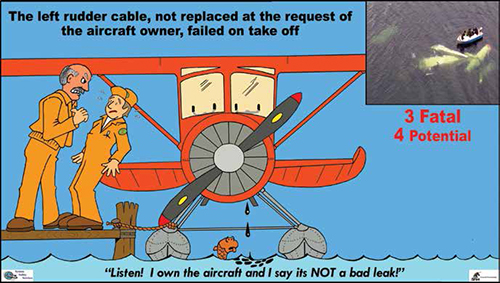 Lack of assertiveness has been a contributing factor in way too many accidents. Looking at the cartoon takes us back to a fatal float plane accident up north many years ago. A conscious aircraft maintenance engineer (AME) found a corroded rudder cable just inside the empennage on a routine annual inspection. He brought it to the attention of the owner of the aircraft, who said that he would order a cable for the next inspection as the cable didn’t look that bad. Not long after, the cable failed on a cross wind take-off, allowing a wing to dip and the aircraft to cartwheel violently and sink in the water. Four passengers were able to escape the sunk aircraft that hung under one float, but the owner, who was flying and not wearing the available shoulder harness, was not one of the fortunate four. By not wearing the shoulder harness, he had received a blow to his head that likely rendered him dazed long enough for him to drown.