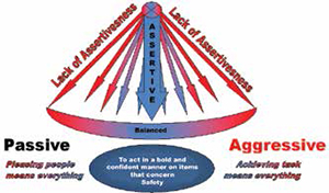 Lack of assertiveness is failing to act in a bold and confident manner on safety concerns. It also is failing to listen to views of others before making a decision. Failing to listen puts you in the aggressive category. Listening means that you are assertive and willing to hear what others have to say, but you still make the safety decision after taking their views into account. The image below illustrates that important balance.