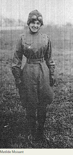 In 1910, brothers Alfred and John Moisant formed the Moisant School of Aviation at Long Island, NY. John was already famous for being the first person to fly across the English Channel carrying a passenger, his mechanic, plus a cat. At the Belmont Air Meet of 1910, he won a race around the Statue of Liberty — later disputed by his competitors. In January John was killed attempting a world’s altitude record flying a Bleriot in New Orleans, LA. Alfred, and sisters, Louise and Matilde, were grief stricken. Nevertheless, the Moisant School opened that spring with its first class including Matilde. She learned how to take apart a monoplane, and easily mastered flight. In September, 1911, she became the second licensed female in the US. (Harriet Quimby was the first, just a few weeks earlier.) Matilde was considered a “natural flyer,” performing at air meets in the US and Mexico. She won the 1911 Rodman Wanamaker Trophy for a women’s altitude record of 1200 feet.