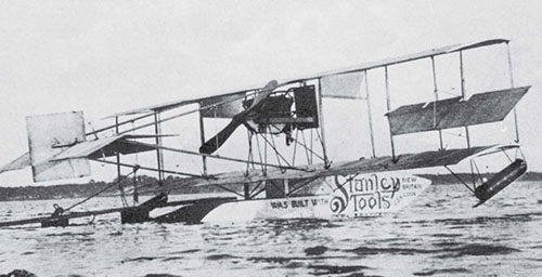 That winter, Owens hired Nelson to build an exhibition biplane which prudently included an optional float when a seaplane landing was required. Stanley paid Nelson to paint “Stanley Tools” on the pontoons of his machine while he toured Florida, Connecticut and Massachusetts. By 1914, with rumors of war in Europe, Nelson quit exhibition flying.