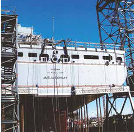 As often as I was privileged to visit the ways, I never got over feeling like a Lilliputian from “Gulliver’s Travels.” Everything was out of scale to the rest of my small world. When the USNS Amelia Earhartwas ready for launch, it was more than 690 feet long with a beam of 105 feet, capable of cruising at 20 knots, and driven by a fixed-pitch propeller powered by four diesel engines.