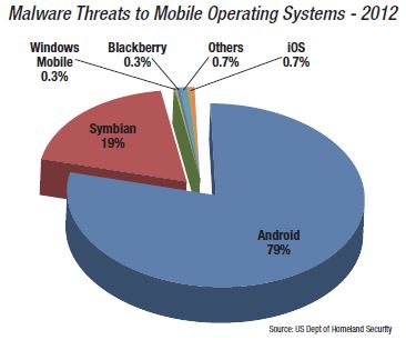 According to a report from the U.S. Department of Homeland Security in July 2013, Android is the world’s most widely used mobile operating system and continues to be a primary target for malware attacks due to its market share and open source architecture. Industry reporting indicates that 44 percent of Android users are still using older versions of the operating system.These have a number of security vulnerabilities that were fixed in later versions. The chart published by the DHS clearly identifies which mobile operating systems were targeted more often.