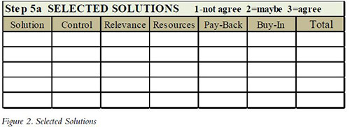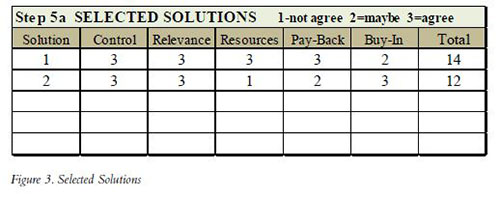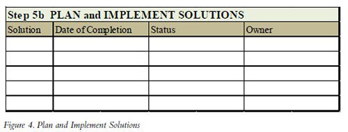 requires a lot a surmising and guess work; however, it can provide a guide in prioritizing the solutions. Once you have prioritized your solutions, you would assign Solution One to an owner who would have responsibility for its implementation if resources are tight. If, on the other hand, you have the resources to pursue both solutions, then that would also get assigned an owner. Regardless, the owner is assigned with a reasonable target date and he/she is supplied with the necessary resources to complete the task. This is all recorded in Step 5b, Figure 4.