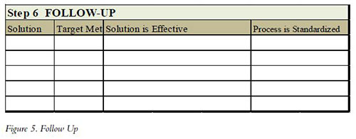 Now you sit back and let the plan progress, right? Wrong. Monitor progress to ensure that roadblocks are removed and that appropriate focus remains on the solution. The “status” may be used for recording the progress as on target, behind target, ahead of target, in process, completed, etc. You can define that as you find fitting but you must provide both clear and unambiguous goals and the means to achieve that result. The important thing is that marking the status complete is not the end of the journey. Did what you did do what it was supposed to do? You need to follow up to ensure that the anticipated gains have been achieved — so we move on to step 6, Figure 5.